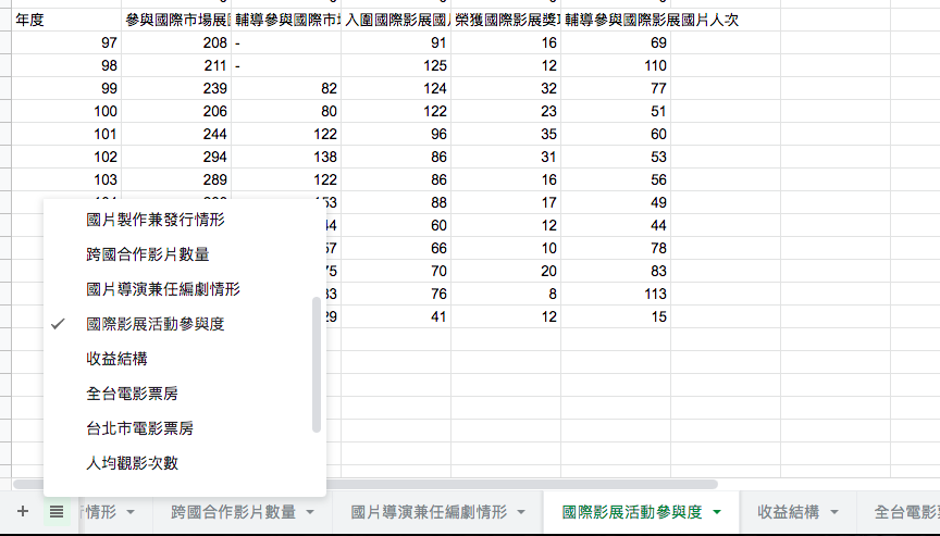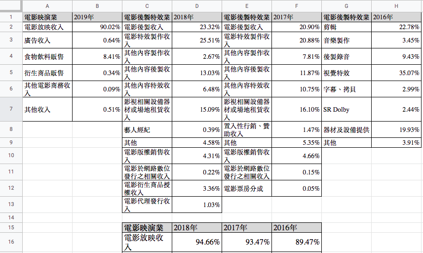 下圖為一錯誤的示範,將多個表格拼貼在一個試算表中,其中包括「電影放映業」、「電影後製特效業」等兩產業,又分別將兩產業各年度之資料分不同表格記載: